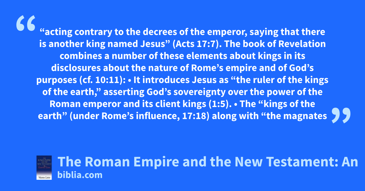 “acting contrary to the decrees of the emperor, saying that there is another king named Jesus” (Acts 17:7). The book of Revelation combines a number of these elements about kings in its disclosures about the nature of Rome’s empire and of God’s purposes (cf. 10:11): • It introduces Jesus as “the ruler of the kings of the earth,” asserting God’s sovereignty over the power of the Roman emperor and its client kings (1:5). • The “kings of the earth” (under Rome’s influence, 17:18) along with “the magnates