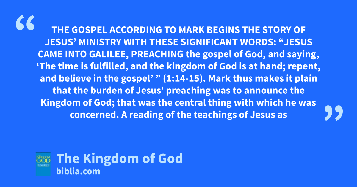 THE GOSPEL ACCORDING TO MARK BEGINS THE STORY OF JESUS’ MINISTRY WITH THESE SIGNIFICANT WORDS: “JESUS CAME INTO GALILEE, PREACHING the gospel of God, and saying, ‘The time is fulfilled, and the kingdom of God is at hand; repent, and believe in the gospel’ ” (1:14-15). Mark thus makes it plain that the burden of Jesus’ preaching was to announce the Kingdom of God; that was the central thing with which he was concerned. A reading of the teachings of Jesus as