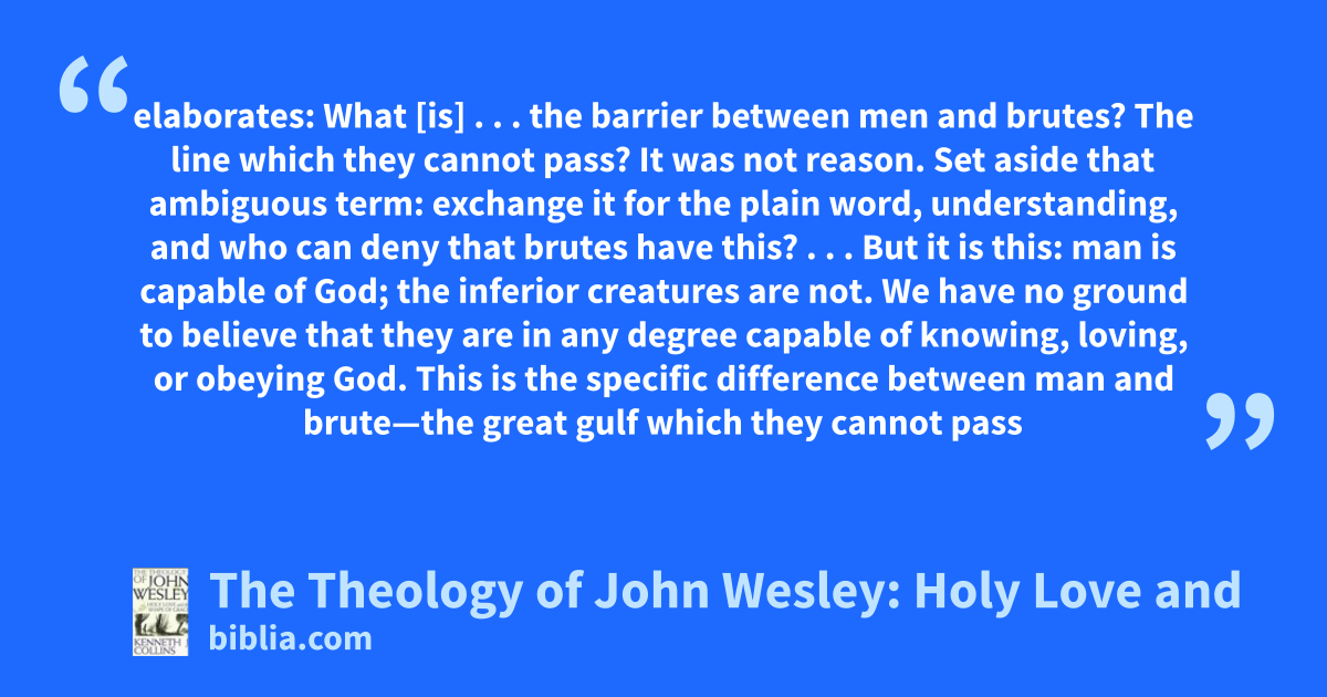 elaborates: What [is] . . . the barrier between men and brutes? The line which they cannot pass? It was not reason. Set aside that ambiguous term: exchange it for the plain word, understanding, and who can deny that brutes have this? . . . But it is this: man is capable of God; the inferior creatures are not. We have no ground to believe that they are in any degree capable of knowing, loving, or obeying God. This is the specific difference between man and brute—the great gulf which they cannot pass