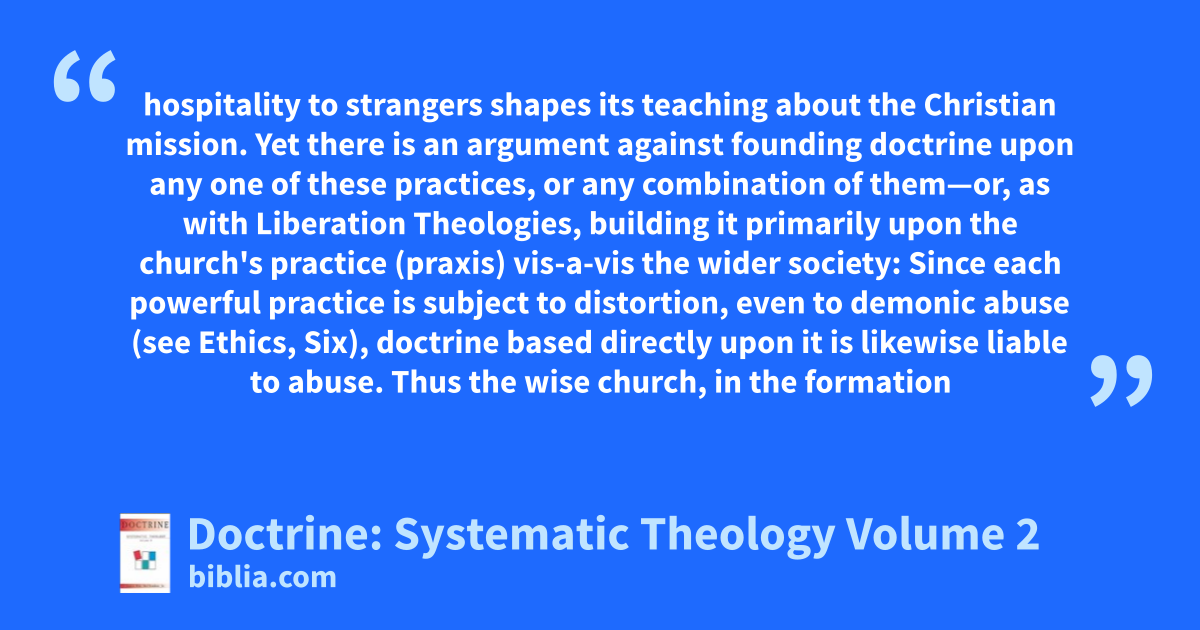 hospitality to strangers shapes its teaching about the Christian mission. Yet there is an argument against founding doctrine upon any one of these practices, or any combination of them—or, as with Liberation Theologies, building it primarily upon the church's practice (praxis) vis-a-vis the wider society: Since each powerful practice is subject to distortion, even to demonic abuse (see Ethics, Six), doctrine based directly upon it is likewise liable to abuse. Thus the wise church, in the formation