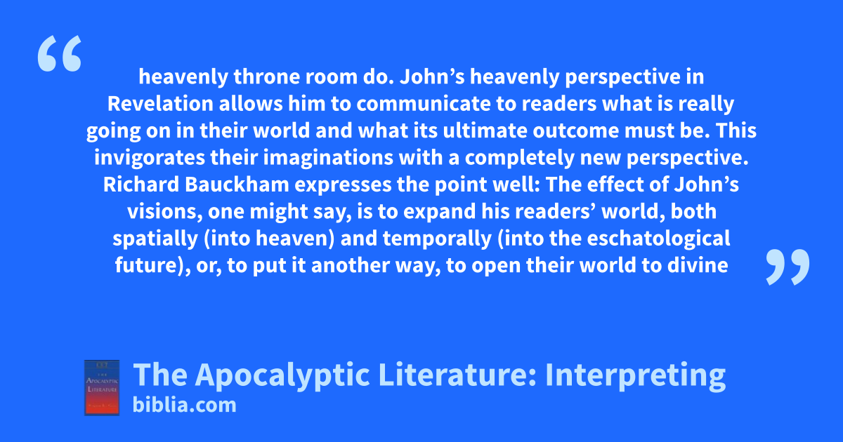 heavenly throne room do. John’s heavenly perspective in Revelation allows him to communicate to readers what is really going on in their world and what its ultimate outcome must be. This invigorates their imaginations with a completely new perspective. Richard Bauckham expresses the point well: The effect of John’s visions, one might say, is to expand his readers’ world, both spatially (into heaven) and temporally (into the eschatological future), or, to put it another way, to open their world to divine