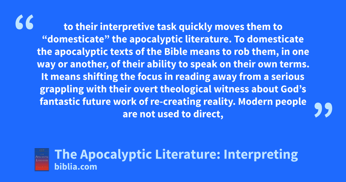 to their interpretive task quickly moves them to “domesticate” the apocalyptic literature. To domesticate the apocalyptic texts of the Bible means to rob them, in one way or another, of their ability to speak on their own terms. It means shifting the focus in reading away from a serious grappling with their overt theological witness about God’s fantastic future work of re-creating reality. Modern people are not used to direct,