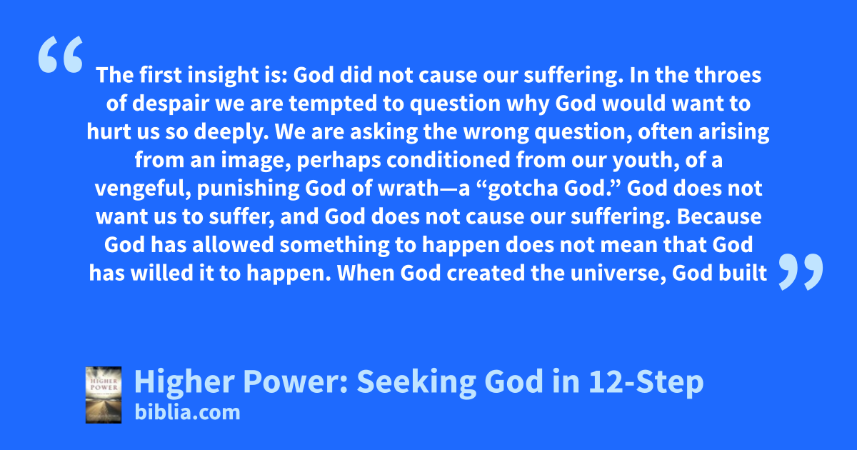 The first insight is: God did not cause our suffering. In the throes of despair we are tempted to question why God would want to hurt us so deeply. We are asking the wrong question, often arising from an image, perhaps conditioned from our youth, of a vengeful, punishing God of wrath—a “gotcha God.” God does not want us to suffer, and God does not cause our suffering. Because God has allowed something to happen does not mean that God has willed it to happen. When God created the universe, God built
