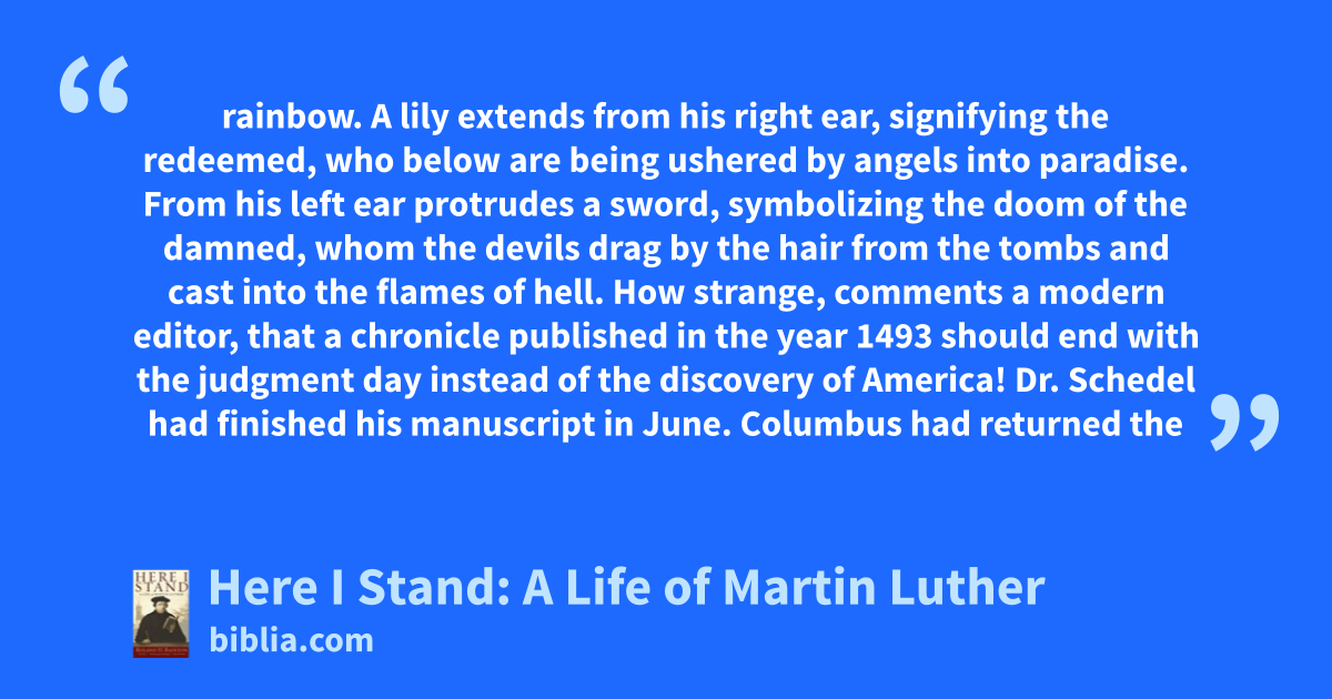 rainbow. A lily extends from his right ear, signifying the redeemed, who below are being ushered by angels into paradise. From his left ear protrudes a sword, symbolizing the doom of the damned, whom the devils drag by the hair from the tombs and cast into the flames of hell. How strange, comments a modern editor, that a chronicle published in the year 1493 should end with the judgment day instead of the discovery of America! Dr. Schedel had finished his manuscript in June. Columbus had returned the