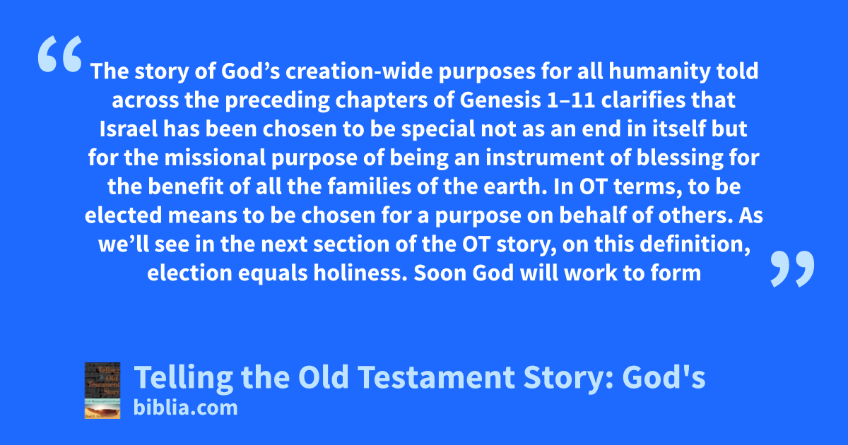 The story of God’s creation-wide purposes for all humanity told across the preceding chapters of Genesis 1–11 clarifies that Israel has been chosen to be special not as an end in itself but for the missional purpose of being an instrument of blessing for the benefit of all the families of the earth. In OT terms, to be elected means to be chosen for a purpose on behalf of others. As we’ll see in the next section of the OT story, on this definition, election equals holiness. Soon God will work to form