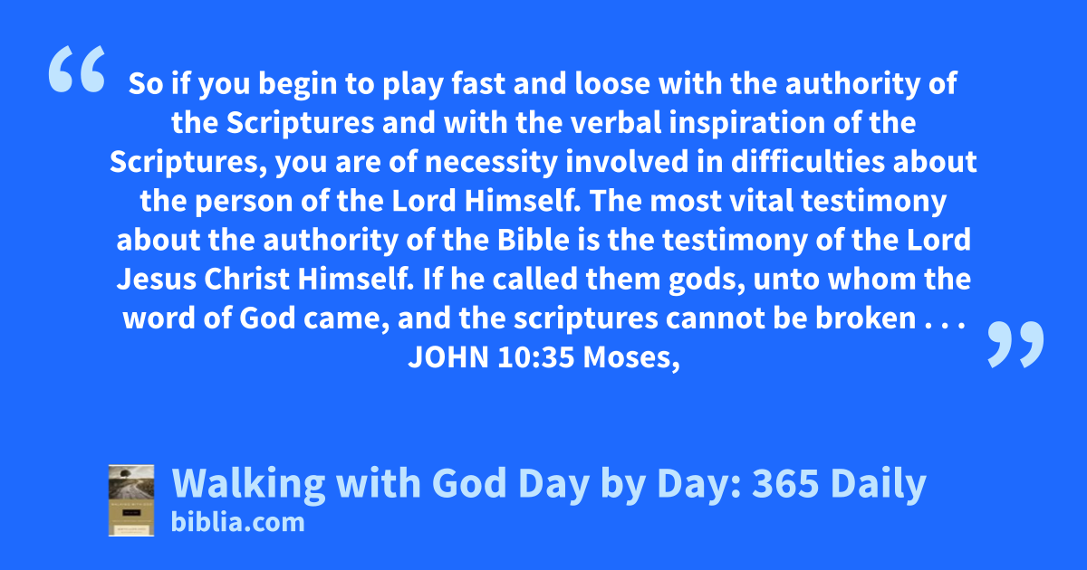 So if you begin to play fast and loose with the authority of the Scriptures and with the verbal inspiration of the Scriptures, you are of necessity involved in difficulties about the person of the Lord Himself. The most vital testimony about the authority of the Bible is the testimony of the Lord Jesus Christ Himself. If he called them gods, unto whom the word of God came, and the scriptures cannot be broken . . . JOHN 10:35 Moses,