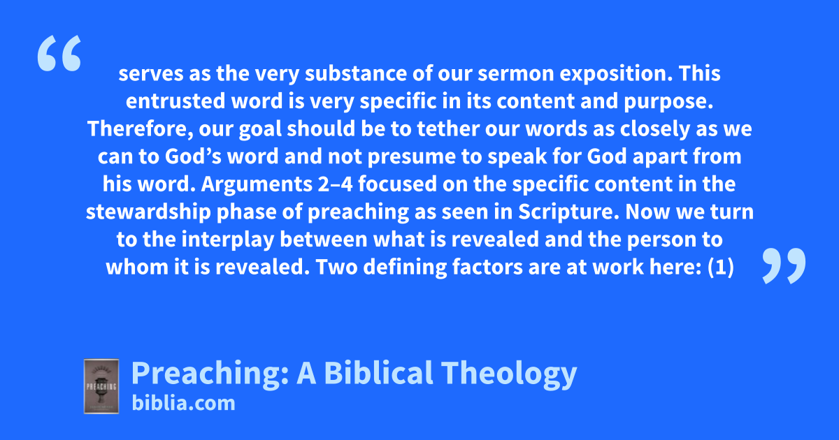 serves as the very substance of our sermon exposition. This entrusted word is very specific in its content and purpose. Therefore, our goal should be to tether our words as closely as we can to God’s word and not presume to speak for God apart from his word. Arguments 2–4 focused on the specific content in the stewardship phase of preaching as seen in Scripture. Now we turn to the interplay between what is revealed and the person to whom it is revealed. Two defining factors are at work here: (1)