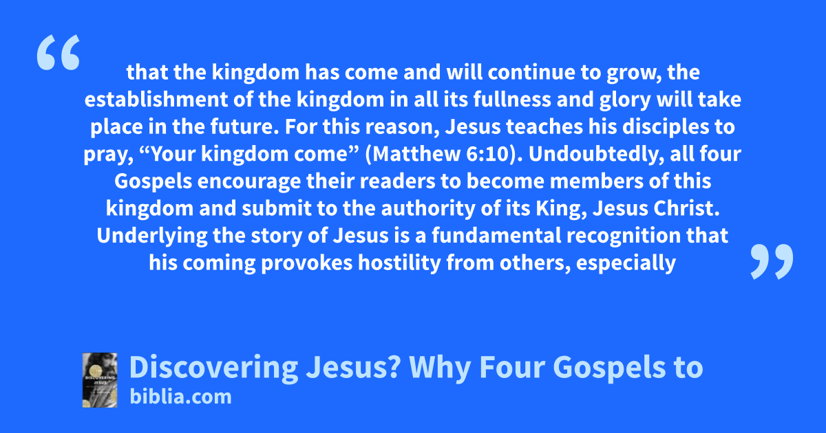 that the kingdom has come and will continue to grow, the establishment of the kingdom in all its fullness and glory will take place in the future. For this reason, Jesus teaches his disciples to pray, “Your kingdom come” (Matthew 6:10). Undoubtedly, all four Gospels encourage their readers to become members of this kingdom and submit to the authority of its King, Jesus Christ. Underlying the story of Jesus is a fundamental recognition that his coming provokes hostility from others, especially