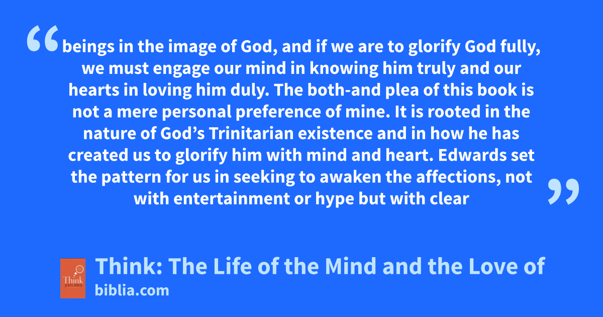 beings in the image of God, and if we are to glorify God fully, we must engage our mind in knowing him truly and our hearts in loving him duly. The both-and plea of this book is not a mere personal preference of mine. It is rooted in the nature of God’s Trinitarian existence and in how he has created us to glorify him with mind and heart. Edwards set the pattern for us in seeking to awaken the affections, not with entertainment or hype but with clear