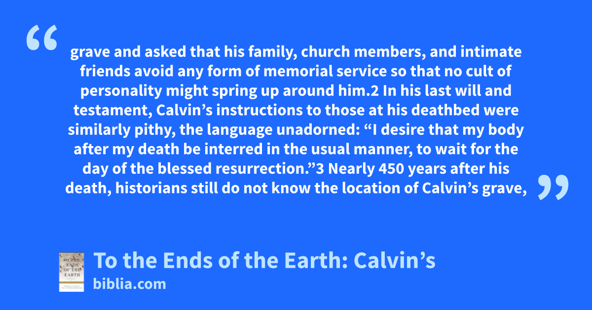 grave and asked that his family, church members, and intimate friends avoid any form of memorial service so that no cult of personality might spring up around him.2 In his last will and testament, Calvin’s instructions to those at his deathbed were similarly pithy, the language unadorned: “I desire that my body after my death be interred in the usual manner, to wait for the day of the blessed resurrection.”3 Nearly 450 years after his death, historians still do not know the location of Calvin’s grave,