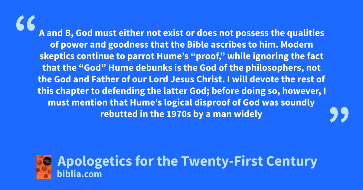 A and B, God must either not exist or does not possess the qualities of power and goodness that the Bible ascribes to him. Modern skeptics continue to parrot Hume’s “proof,” while ignoring the fact that the “God” Hume debunks is the God of the philosophers, not the God and Father of our Lord Jesus Christ. I will devote the rest of this chapter to defending the latter God; before doing so, however, I must mention that Hume’s logical disproof of God was soundly rebutted in the 1970s by a man widely