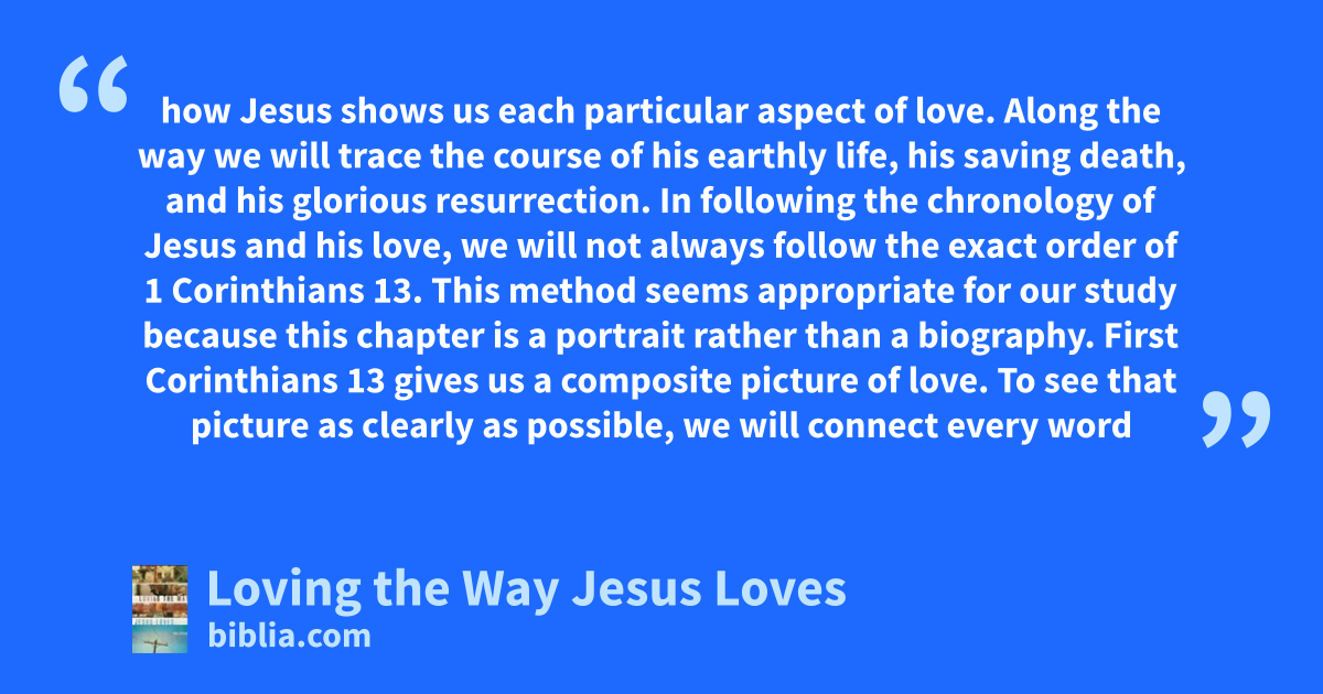 how Jesus shows us each particular aspect of love. Along the way we will trace the course of his earthly life, his saving death, and his glorious resurrection. In following the chronology of Jesus and his love, we will not always follow the exact order of 1 Corinthians 13. This method seems appropriate for our study because this chapter is a portrait rather than a biography. First Corinthians 13 gives us a composite picture of love. To see that picture as clearly as possible, we will connect every word