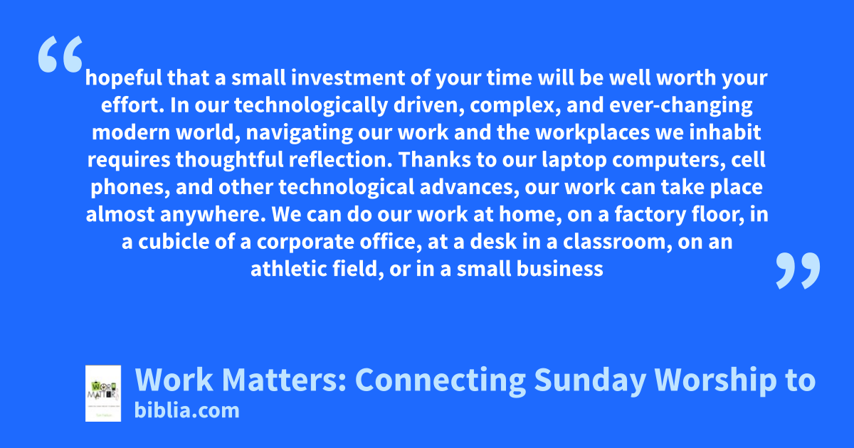 hopeful that a small investment of your time will be well worth your effort. In our technologically driven, complex, and ever-changing modern world, navigating our work and the workplaces we inhabit requires thoughtful reflection. Thanks to our laptop computers, cell phones, and other technological advances, our work can take place almost anywhere. We can do our work at home, on a factory floor, in a cubicle of a corporate office, at a desk in a classroom, on an athletic field, or in a small business