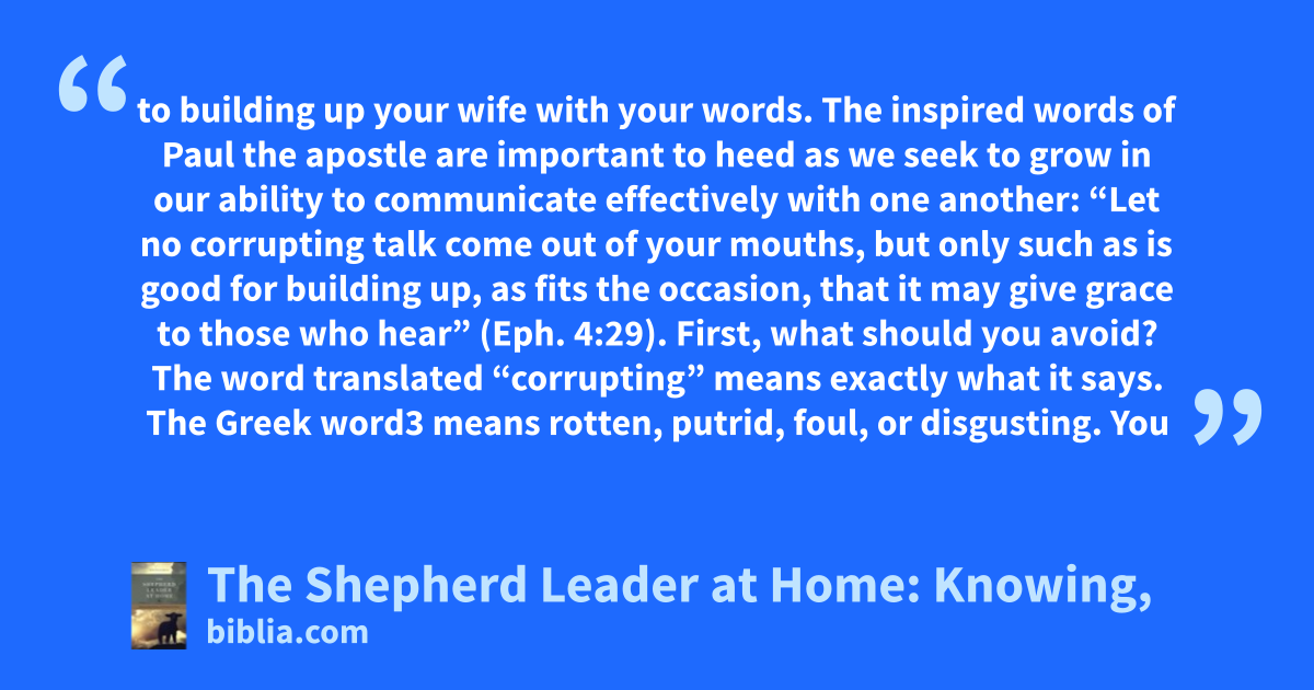to building up your wife with your words. The inspired words of Paul the apostle are important to heed as we seek to grow in our ability to communicate effectively with one another: “Let no corrupting talk come out of your mouths, but only such as is good for building up, as fits the occasion, that it may give grace to those who hear” (Eph. 4:29). First, what should you avoid? The word translated “corrupting” means exactly what it says. The Greek word3 means rotten, putrid, foul, or disgusting. You