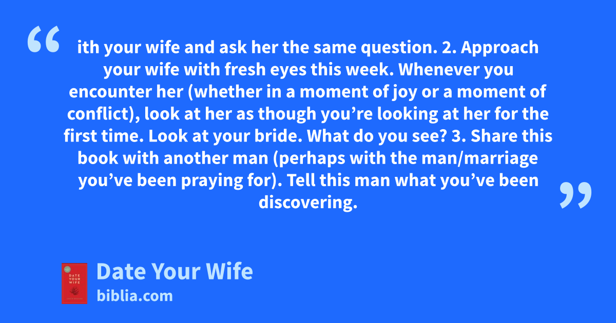 ith your wife and ask her the same question. 2. Approach your wife with fresh eyes this week. Whenever you encounter her (whether in a moment of joy or a moment of conflict), look at her as though you’re looking at her for the first time. Look at your bride. What do you see? 3. Share this book with another man (perhaps with the man/marriage you’ve been praying for). Tell this man what you’ve been discovering.