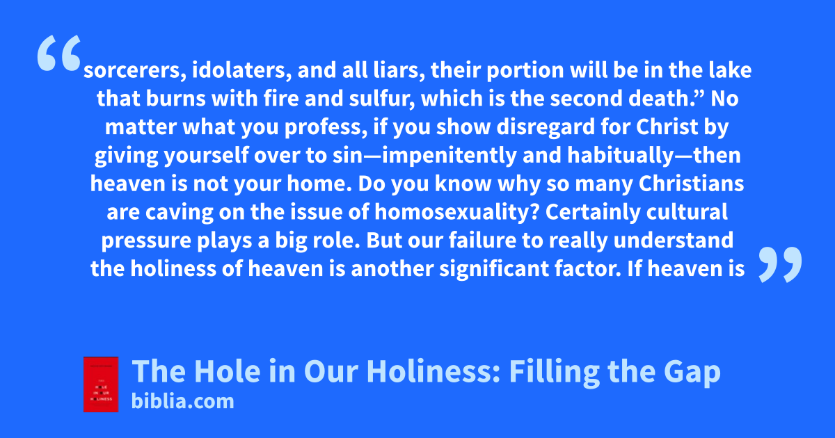sorcerers, idolaters, and all liars, their portion will be in the lake that burns with fire and sulfur, which is the second death.” No matter what you profess, if you show disregard for Christ by giving yourself over to sin—impenitently and habitually—then heaven is not your home. Do you know why so many Christians are caving on the issue of homosexuality? Certainly cultural pressure plays a big role. But our failure to really understand the holiness of heaven is another significant factor. If heaven is
