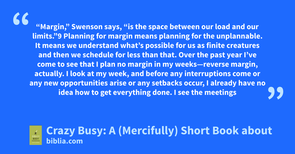 “Margin,” Swenson says, “is the space between our load and our limits.”9 Planning for margin means planning for the unplannable. It means we understand what’s possible for us as finite creatures and then we schedule for less than that. Over the past year I’ve come to see that I plan no margin in my weeks—reverse margin, actually. I look at my week, and before any interruptions come or any new opportunities arise or any setbacks occur, I already have no idea how to get everything done. I see the meetings