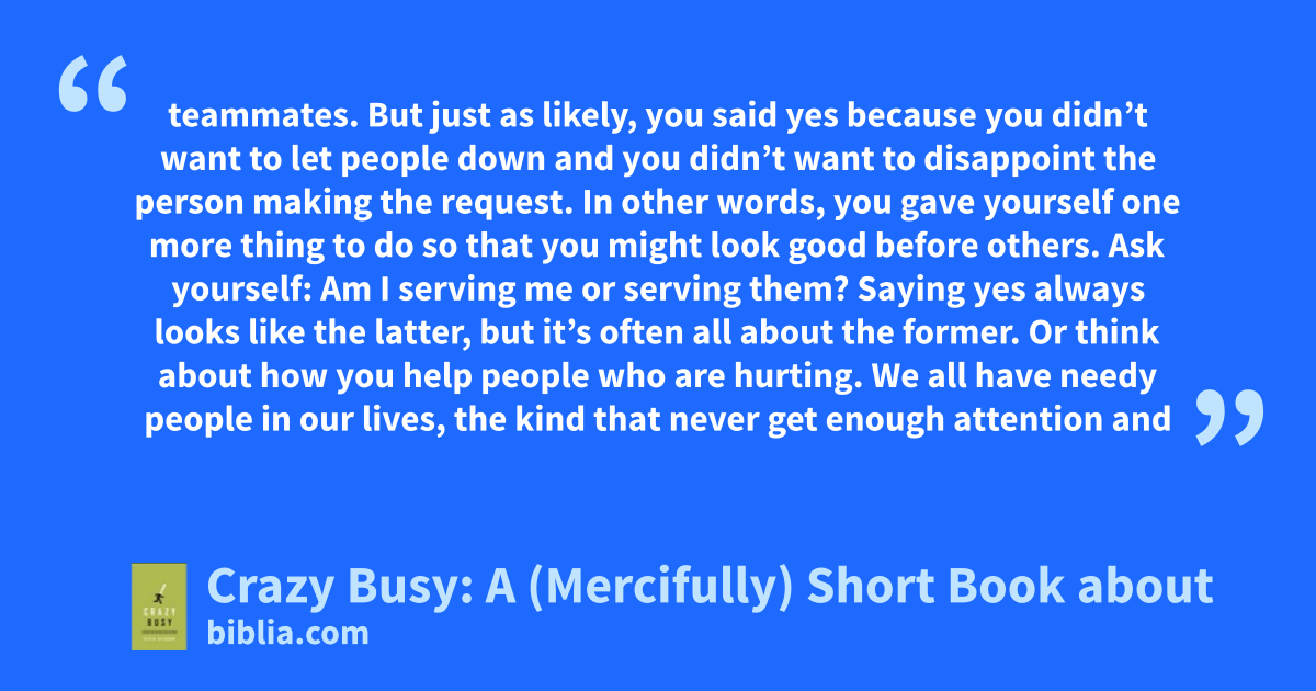 teammates. But just as likely, you said yes because you didn’t want to let people down and you didn’t want to disappoint the person making the request. In other words, you gave yourself one more thing to do so that you might look good before others. Ask yourself: Am I serving me or serving them? Saying yes always looks like the latter, but it’s often all about the former. Or think about how you help people who are hurting. We all have needy people in our lives, the kind that never get enough attention and