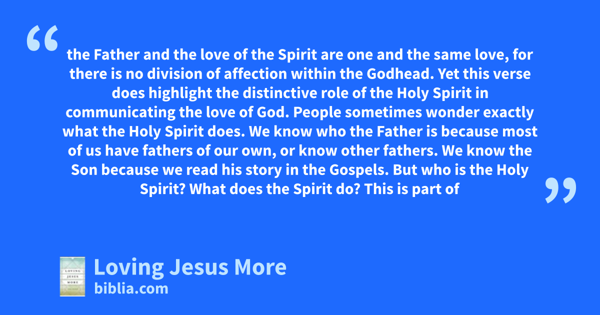 the Father and the love of the Spirit are one and the same love, for there is no division of affection within the Godhead. Yet this verse does highlight the distinctive role of the Holy Spirit in communicating the love of God. People sometimes wonder exactly what the Holy Spirit does. We know who the Father is because most of us have fathers of our own, or know other fathers. We know the Son because we read his story in the Gospels. But who is the Holy Spirit? What does the Spirit do? This is part of