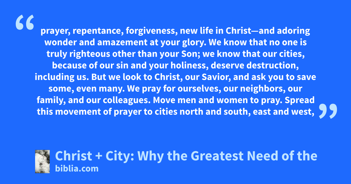prayer, repentance, forgiveness, new life in Christ—and adoring wonder and amazement at your glory. We know that no one is truly righteous other than your Son; we know that our cities, because of our sin and your holiness, deserve destruction, including us. But we look to Christ, our Savior, and ask you to save some, even many. We pray for ourselves, our neighbors, our family, and our colleagues. Move men and women to pray. Spread this movement of prayer to cities north and south, east and west,