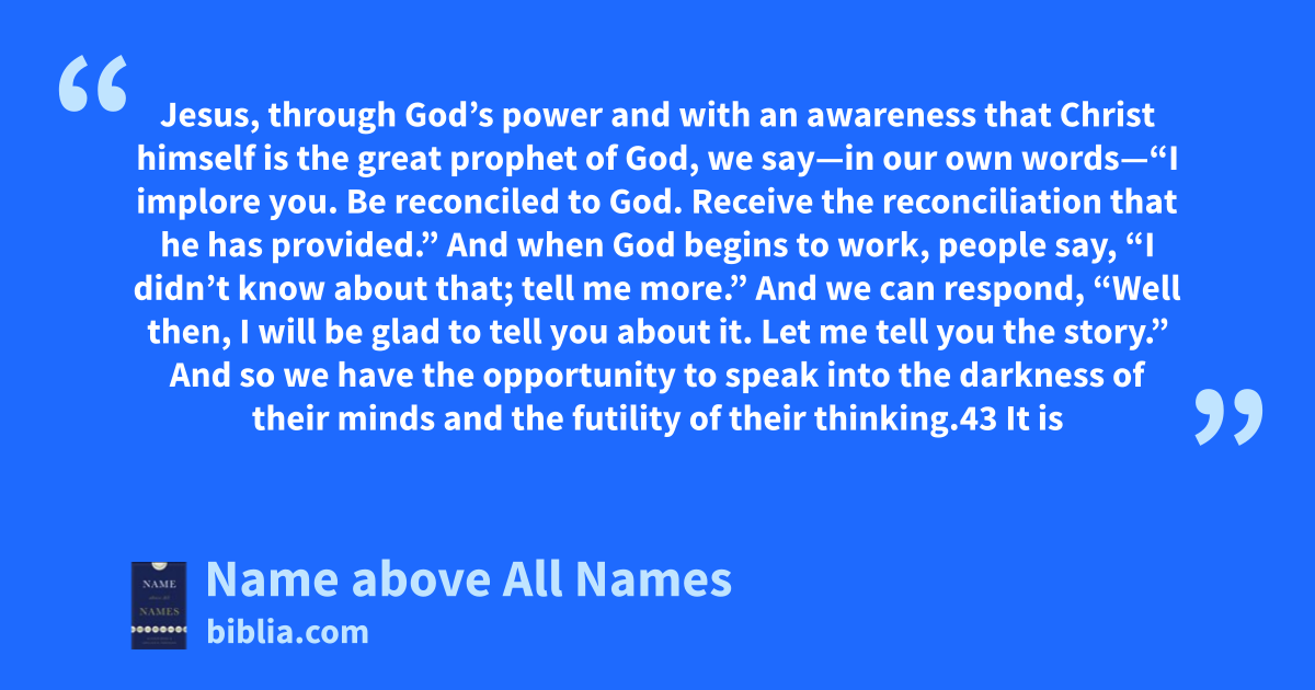 Jesus, through God’s power and with an awareness that Christ himself is the great prophet of God, we say—in our own words—“I implore you. Be reconciled to God. Receive the reconciliation that he has provided.” And when God begins to work, people say, “I didn’t know about that; tell me more.” And we can respond, “Well then, I will be glad to tell you about it. Let me tell you the story.” And so we have the opportunity to speak into the darkness of their minds and the futility of their thinking.43 It is