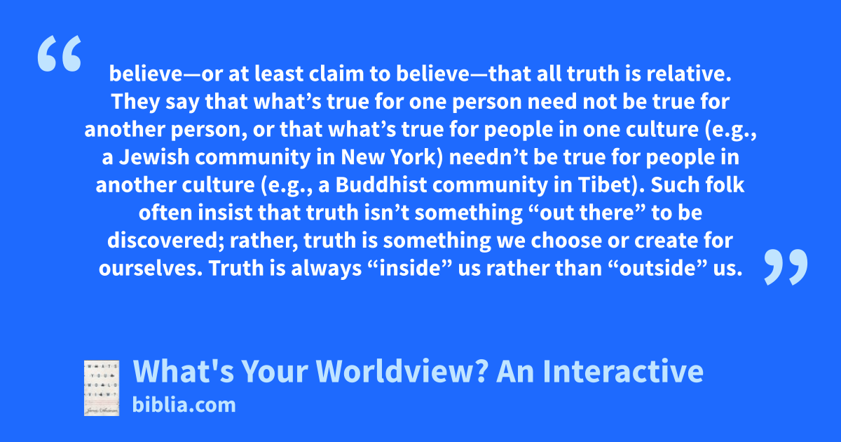 believe—or at least claim to believe—that all truth is relative. They say that what’s true for one person need not be true for another person, or that what’s true for people in one culture (e.g., a Jewish community in New York) needn’t be true for people in another culture (e.g., a Buddhist community in Tibet). Such folk often insist that truth isn’t something “out there” to be discovered; rather, truth is something we choose or create for ourselves. Truth is always “inside” us rather than “outside” us.