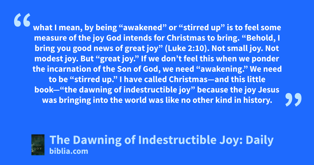 what I mean, by being “awakened” or “stirred up” is to feel some measure of the joy God intends for Christmas to bring. “Behold, I bring you good news of great joy” (Luke 2:10). Not small joy. Not modest joy. But “great joy.” If we don’t feel this when we ponder the incarnation of the Son of God, we need “awakening.” We need to be “stirred up.” I have called Christmas—and this little book—“the dawning of indestructible joy” because the joy Jesus was bringing into the world was like no other kind in history.