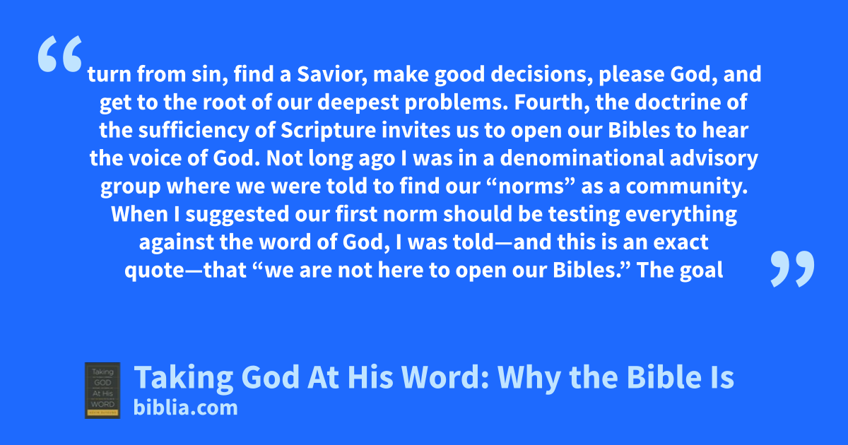 turn from sin, find a Savior, make good decisions, please God, and get to the root of our deepest problems. Fourth, the doctrine of the sufficiency of Scripture invites us to open our Bibles to hear the voice of God. Not long ago I was in a denominational advisory group where we were told to find our “norms” as a community. When I suggested our first norm should be testing everything against the word of God, I was told—and this is an exact quote—that “we are not here to open our Bibles.” The goal