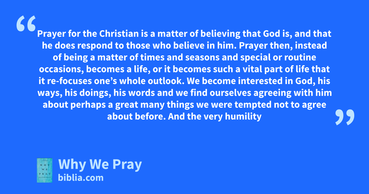 Prayer for the Christian is a matter of believing that God is, and that he does respond to those who believe in him. Prayer then, instead of being a matter of times and seasons and special or routine occasions, becomes a life, or it becomes such a vital part of life that it re-focuses one’s whole outlook. We become interested in God, his ways, his doings, his words and we find ourselves agreeing with him about perhaps a great many things we were tempted not to agree about before. And the very humility