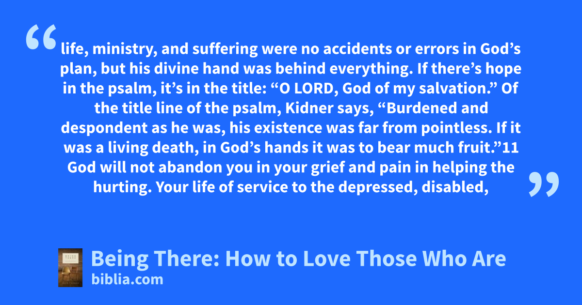 life, ministry, and suffering were no accidents or errors in God’s plan, but his divine hand was behind everything. If there’s hope in the psalm, it’s in the title: “O LORD, God of my salvation.” Of the title line of the psalm, Kidner says, “Burdened and despondent as he was, his existence was far from pointless. If it was a living death, in God’s hands it was to bear much fruit.”11 God will not abandon you in your grief and pain in helping the hurting. Your life of service to the depressed, disabled,