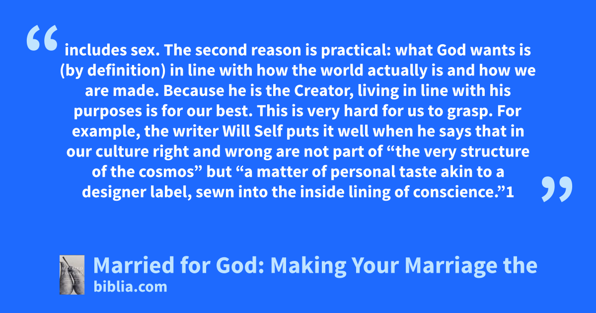 includes sex. The second reason is practical: what God wants is (by definition) in line with how the world actually is and how we are made. Because he is the Creator, living in line with his purposes is for our best. This is very hard for us to grasp. For example, the writer Will Self puts it well when he says that in our culture right and wrong are not part of “the very structure of the cosmos” but “a matter of personal taste akin to a designer label, sewn into the inside lining of conscience.”1