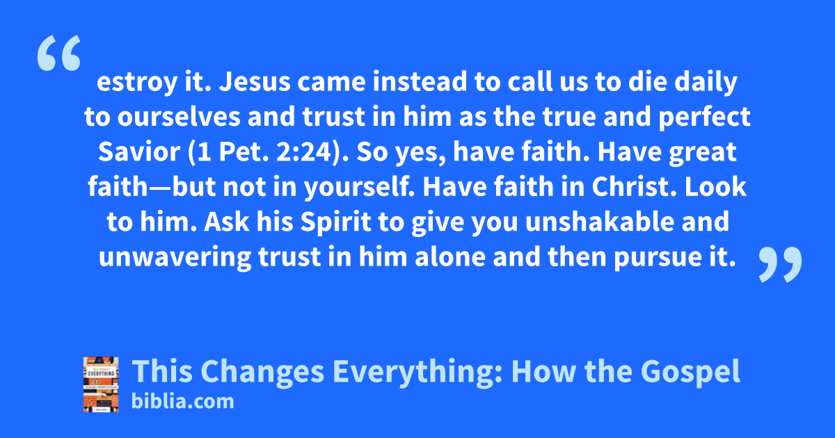 estroy it. Jesus came instead to call us to die daily to ourselves and trust in him as the true and perfect Savior (1 Pet. 2:24). So yes, have faith. Have great faith—but not in yourself. Have faith in Christ. Look to him. Ask his Spirit to give you unshakable and unwavering trust in him alone and then pursue it.