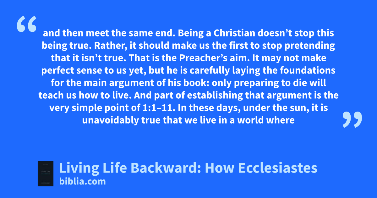 and then meet the same end. Being a Christian doesn’t stop this being true. Rather, it should make us the first to stop pretending that it isn’t true. That is the Preacher’s aim. It may not make perfect sense to us yet, but he is carefully laying the foundations for the main argument of his book: only preparing to die will teach us how to live. And part of establishing that argument is the very simple point of 1:1–11. In these days, under the sun, it is unavoidably true that we live in a world where
