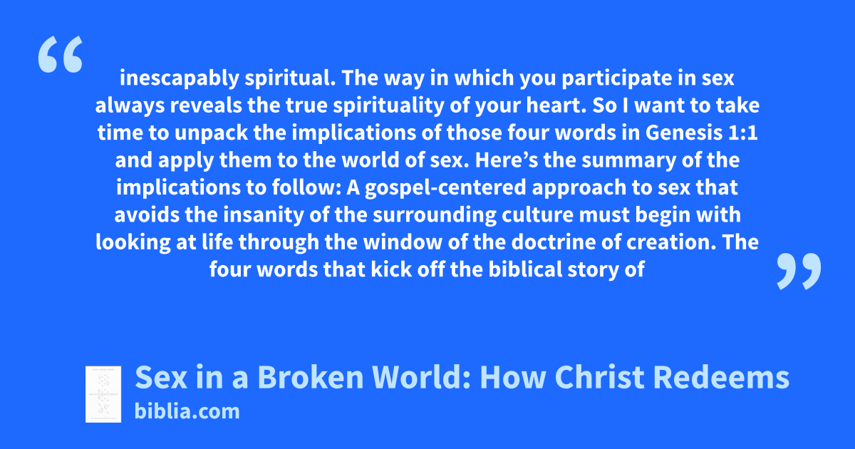 inescapably spiritual. The way in which you participate in sex always reveals the true spirituality of your heart. So I want to take time to unpack the implications of those four words in Genesis 1:1 and apply them to the world of sex. Here’s the summary of the implications to follow: A gospel-centered approach to sex that avoids the insanity of the surrounding culture must begin with looking at life through the window of the doctrine of creation. The four words that kick off the biblical story of