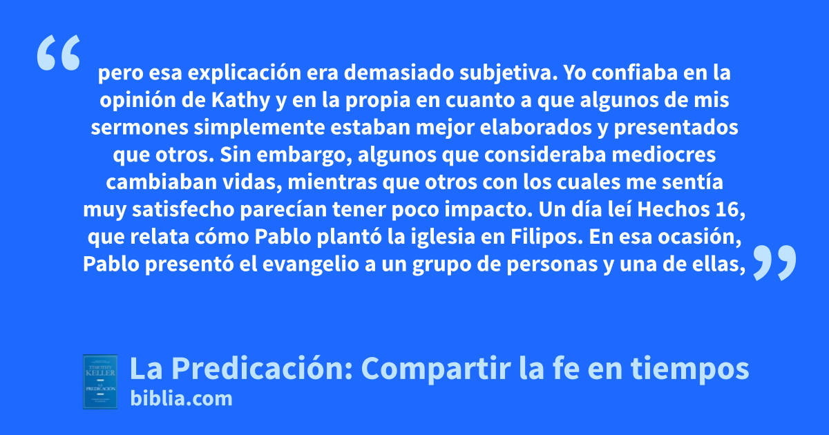 pero esa explicación era demasiado subjetiva. Yo confiaba en la opinión de Kathy y en la propia en cuanto a que algunos de mis sermones simplemente estaban mejor elaborados y presentados que otros. Sin embargo, algunos que consideraba mediocres cambiaban vidas, mientras que otros con los cuales me sentía muy satisfecho parecían tener poco impacto. Un día leí Hechos 16, que relata cómo Pablo plantó la iglesia en Filipos. En esa ocasión, Pablo presentó el evangelio a un grupo de personas y una de ellas,