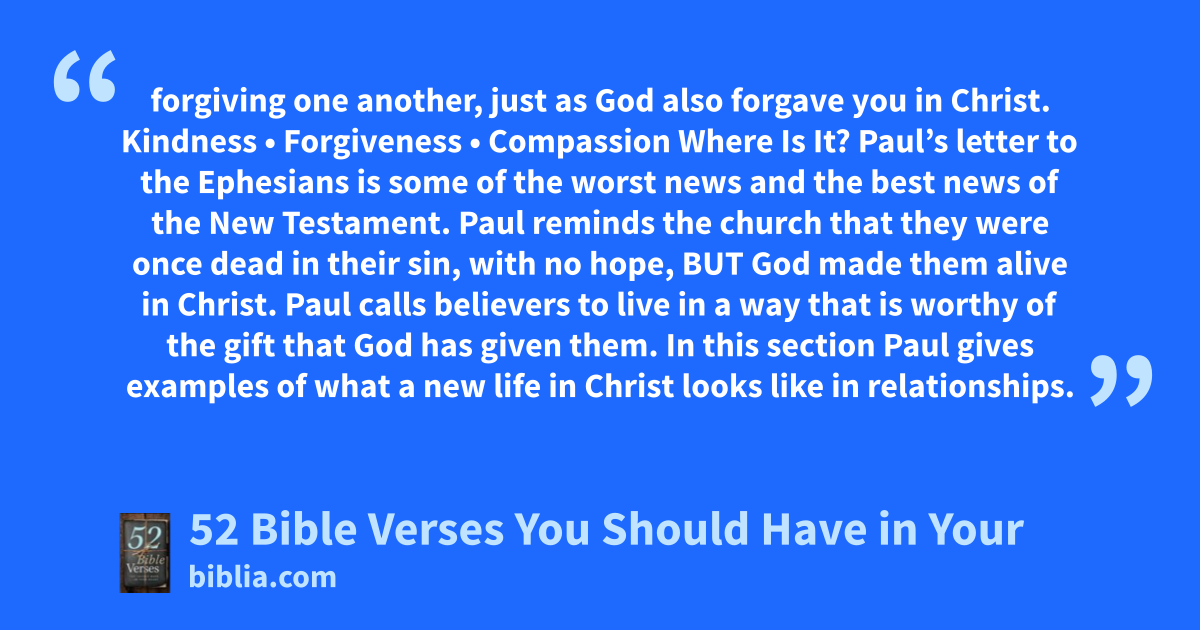 forgiving one another, just as God also forgave you in Christ. Kindness • Forgiveness • Compassion Where Is It? Paul’s letter to the Ephesians is some of the worst news and the best news of the New Testament. Paul reminds the church that they were once dead in their sin, with no hope, BUT God made them alive in Christ. Paul calls believers to live in a way that is worthy of the gift that God has given them. In this section Paul gives examples of what a new life in Christ looks like in relationships.