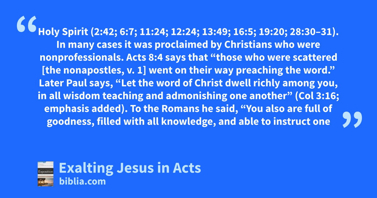 Holy Spirit (2:42; 6:7; 11:24; 12:24; 13:49; 16:5; 19:20; 28:30–31). In many cases it was proclaimed by Christians who were nonprofessionals. Acts 8:4 says that “those who were scattered [the nonapostles, v. 1] went on their way preaching the word.” Later Paul says, “Let the word of Christ dwell richly among you, in all wisdom teaching and admonishing one another” (Col 3:16; emphasis added). To the Romans he said, “You also are full of goodness, filled with all knowledge, and able to instruct one