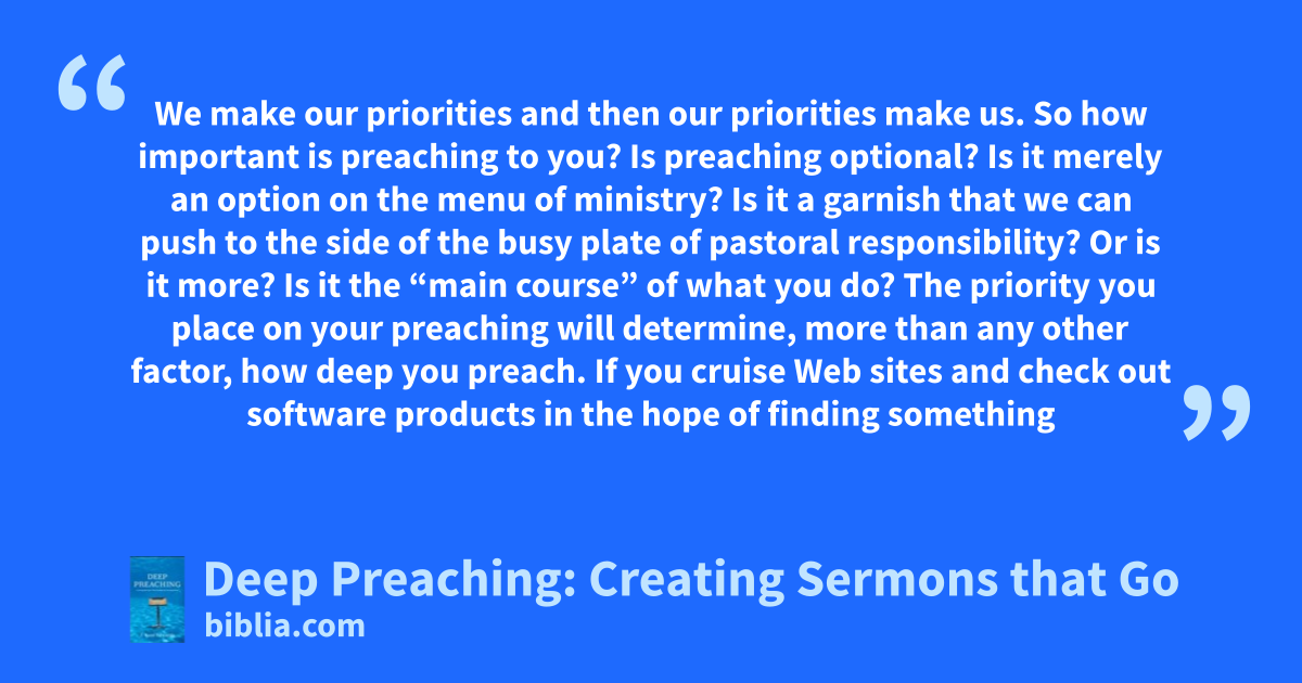 We make our priorities and then our priorities make us. So how important is preaching to you? Is preaching optional? Is it merely an option on the menu of ministry? Is it a garnish that we can push to the side of the busy plate of pastoral responsibility? Or is it more? Is it the “main course” of what you do? The priority you place on your preaching will determine, more than any other factor, how deep you preach. If you cruise Web sites and check out software products in the hope of finding something