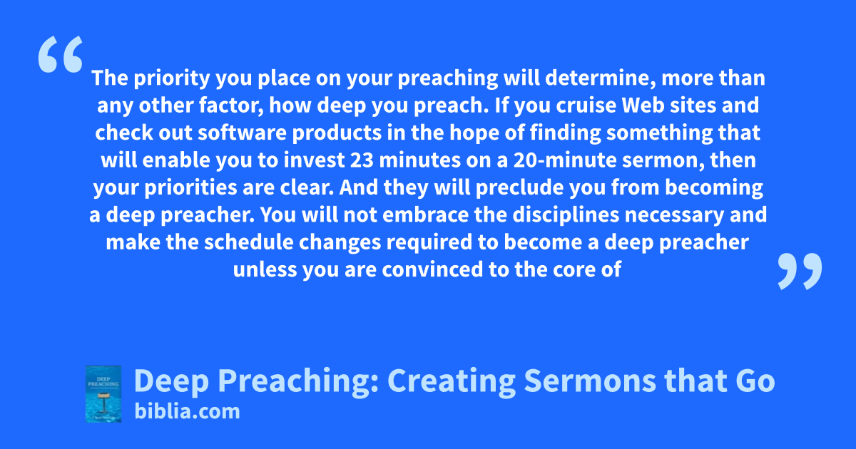 The priority you place on your preaching will determine, more than any other factor, how deep you preach. If you cruise Web sites and check out software products in the hope of finding something that will enable you to invest 23 minutes on a 20-minute sermon, then your priorities are clear. And they will preclude you from becoming a deep preacher. You will not embrace the disciplines necessary and make the schedule changes required to become a deep preacher unless you are convinced to the core of