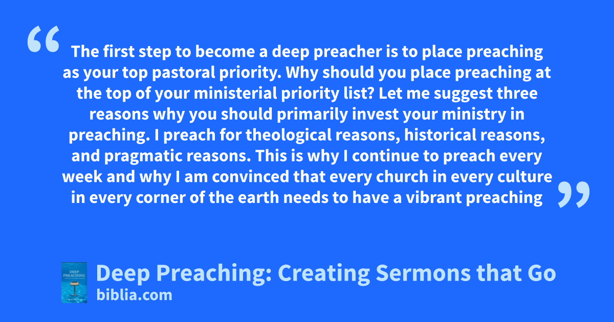 The first step to become a deep preacher is to place preaching as your top pastoral priority. Why should you place preaching at the top of your ministerial priority list? Let me suggest three reasons why you should primarily invest your ministry in preaching. I preach for theological reasons, historical reasons, and pragmatic reasons. This is why I continue to preach every week and why I am convinced that every church in every culture in every corner of the earth needs to have a vibrant preaching