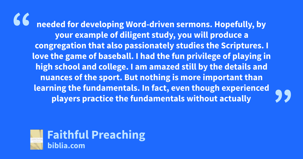 needed for developing Word-driven sermons. Hopefully, by your example of diligent study, you will produce a congregation that also passionately studies the Scriptures. I love the game of baseball. I had the fun privilege of playing in high school and college. I am amazed still by the details and nuances of the sport. But nothing is more important than learning the fundamentals. In fact, even though experienced players practice the fundamentals without actually
