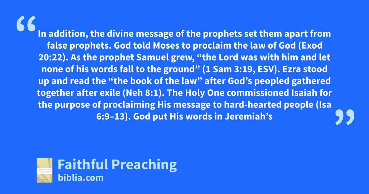 In addition, the divine message of the prophets set them apart from false prophets. God told Moses to proclaim the law of God (Exod 20:22). As the prophet Samuel grew, “the Lord was with him and let none of his words fall to the ground” (1 Sam 3:19, ESV). Ezra stood up and read the “the book of the law” after God’s peopled gathered together after exile (Neh 8:1). The Holy One commissioned Isaiah for the purpose of proclaiming His message to hard-hearted people (Isa 6:9–13). God put His words in Jeremiah’s