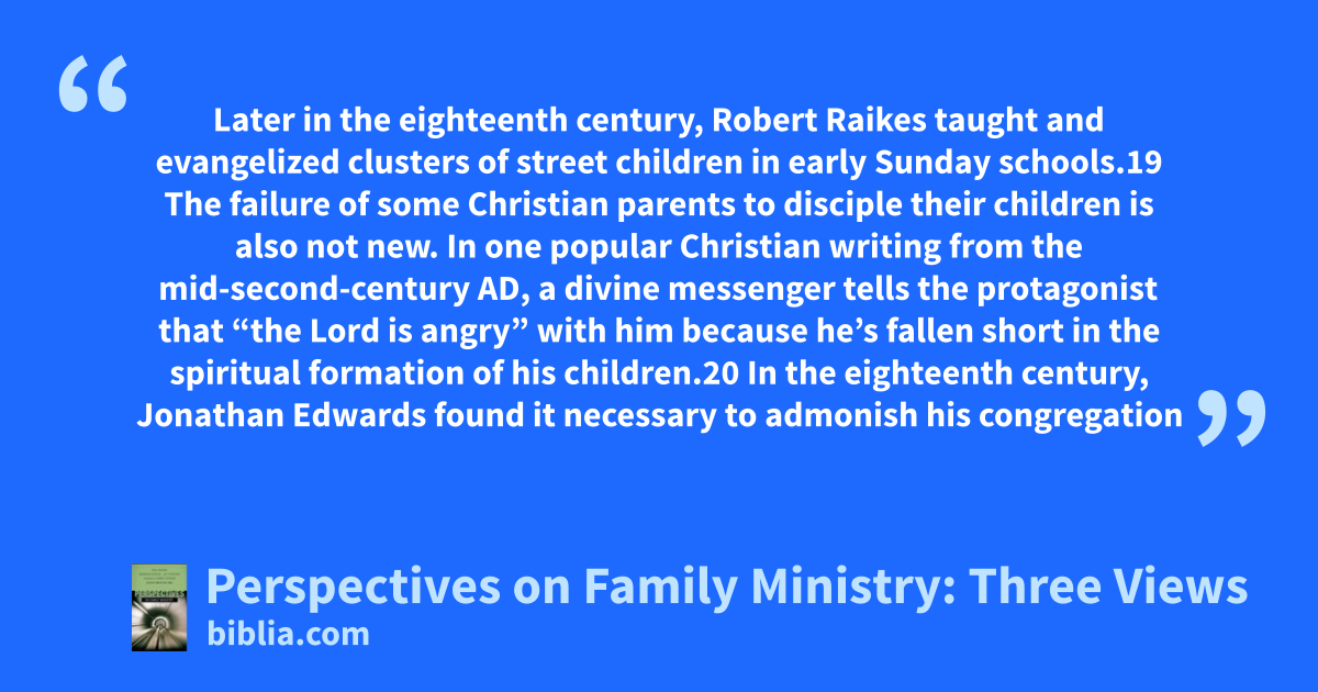 Later in the eighteenth century, Robert Raikes taught and evangelized clusters of street children in early Sunday schools.19 The failure of some Christian parents to disciple their children is also not new. In one popular Christian writing from the mid-second-century AD, a divine messenger tells the protagonist that “the Lord is angry” with him because he’s fallen short in the spiritual formation of his children.20 In the eighteenth century, Jonathan Edwards found it necessary to admonish his congregation