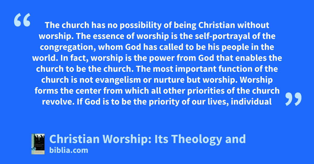 The church has no possibility of being Christian without worship. The essence of worship is the self-portrayal of the congregation, whom God has called to be his people in the world. In fact, worship is the power from God that enables the church to be the church. The most important function of the church is not evangelism or nurture but worship. Worship forms the center from which all other priorities of the church revolve. If God is to be the priority of our lives, individual