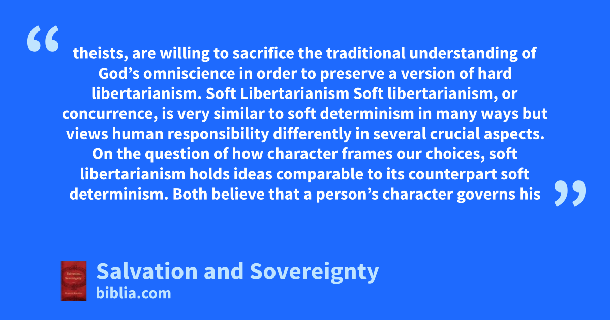 theists, are willing to sacrifice the traditional understanding of God’s omniscience in order to preserve a version of hard libertarianism. Soft Libertarianism Soft libertarianism, or concurrence, is very similar to soft determinism in many ways but views human responsibility differently in several crucial aspects. On the question of how character frames our choices, soft libertarianism holds ideas comparable to its counterpart soft determinism. Both believe that a person’s character governs his