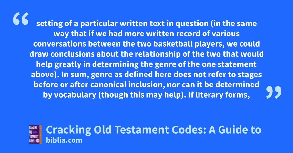 setting of a particular written text in question (in the same way that if we had more written record of various conversations between the two basketball players, we could draw conclusions about the relationship of the two that would help greatly in determining the genre of the one statement above). In sum, genre as defined here does not refer to stages before or after canonical inclusion, nor can it be determined by vocabulary (though this may help). If literary forms,