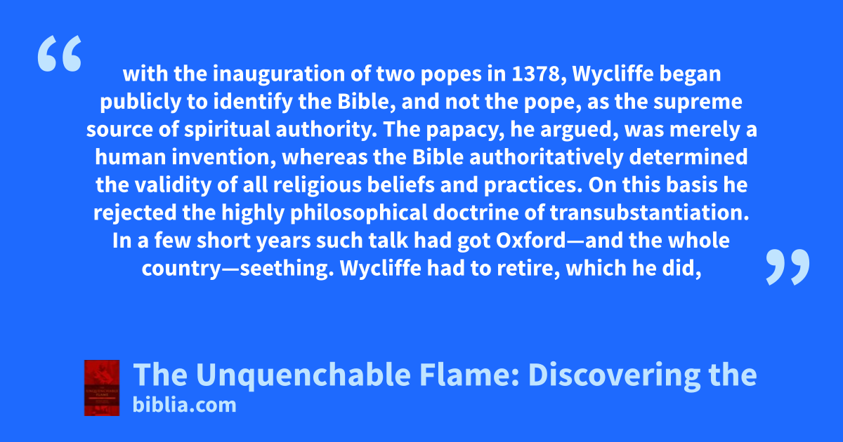 with the inauguration of two popes in 1378, Wycliffe began publicly to identify the Bible, and not the pope, as the supreme source of spiritual authority. The papacy, he argued, was merely a human invention, whereas the Bible authoritatively determined the validity of all religious beliefs and practices. On this basis he rejected the highly philosophical doctrine of transubstantiation. In a few short years such talk had got Oxford—and the whole country—seething. Wycliffe had to retire, which he did,