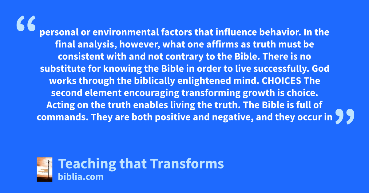 personal or environmental factors that influence behavior. In the final analysis, however, what one affirms as truth must be consistent with and not contrary to the Bible. There is no substitute for knowing the Bible in order to live successfully. God works through the biblically enlightened mind. CHOICES The second element encouraging transforming growth is choice. Acting on the truth enables living the truth. The Bible is full of commands. They are both positive and negative, and they occur in