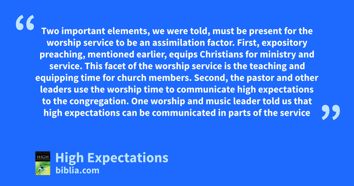 Two important elements, we were told, must be present for the worship service to be an assimilation factor. First, expository preaching, mentioned earlier, equips Christians for ministry and service. This facet of the worship service is the teaching and equipping time for church members. Second, the pastor and other leaders use the worship time to communicate high expectations to the congregation. One worship and music leader told us that high expectations can be communicated in parts of the service