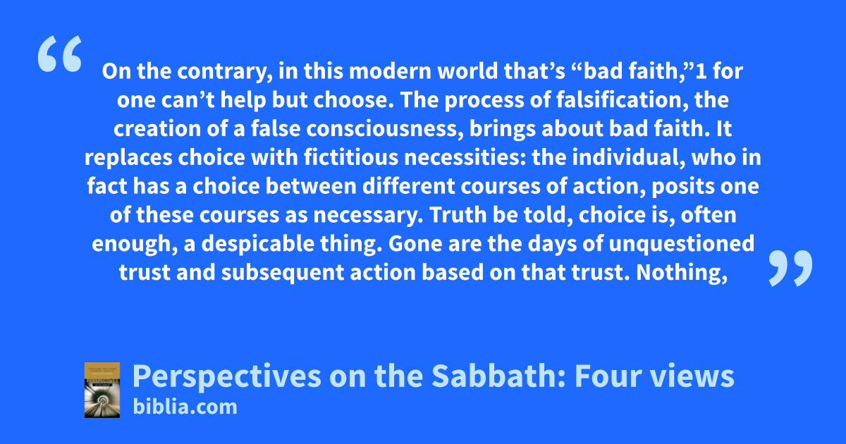 On the contrary, in this modern world that’s “bad faith,”1 for one can’t help but choose. The process of falsification, the creation of a false consciousness, brings about bad faith. It replaces choice with fictitious necessities: the individual, who in fact has a choice between different courses of action, posits one of these courses as necessary. Truth be told, choice is, often enough, a despicable thing. Gone are the days of unquestioned trust and subsequent action based on that trust. Nothing,